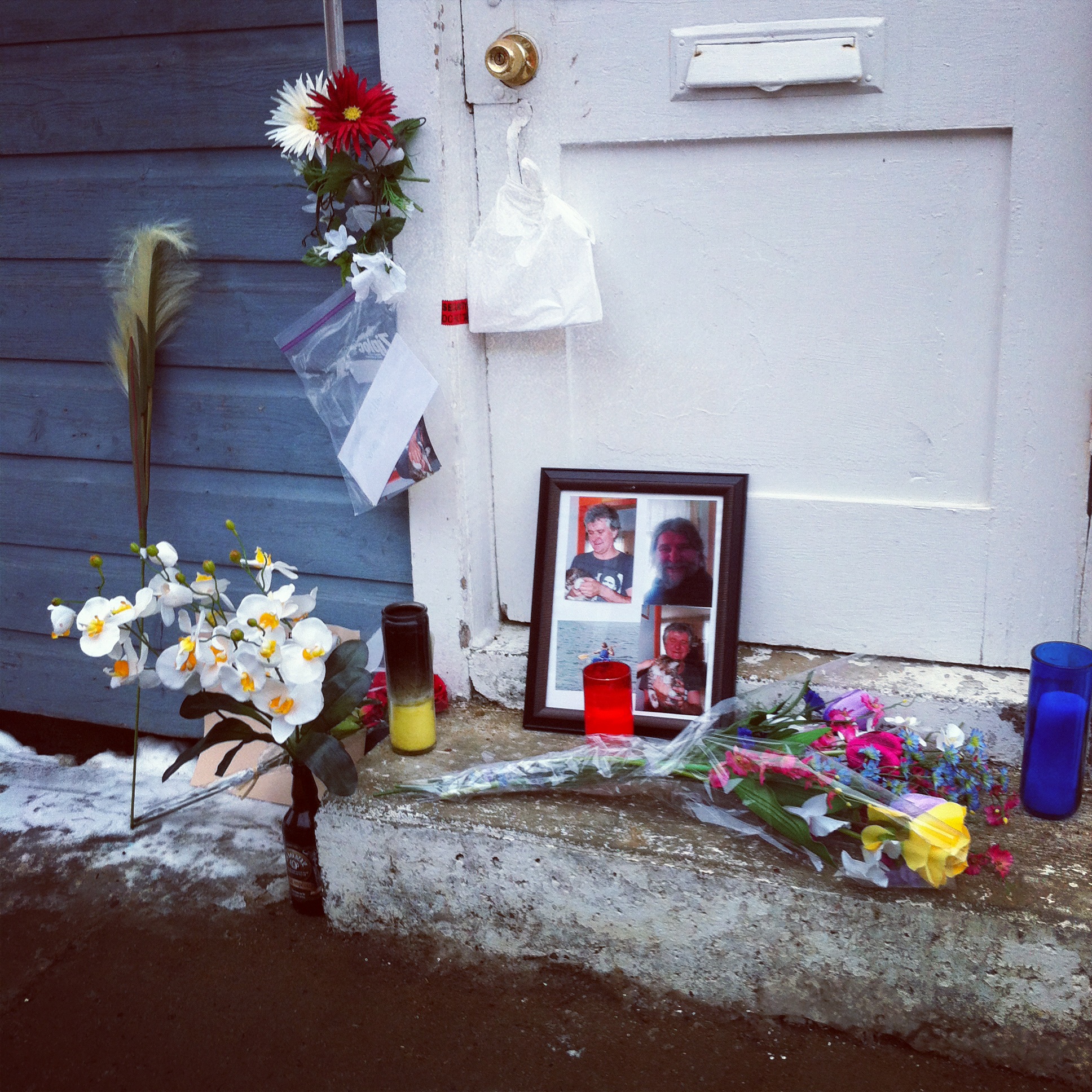 Depuis que la surveillance s’est arrêtée, un petit autel s’installe tranquillement à la porte de la petite maison bleue. Ça a commencé par deux roses rouges. Puis une chandelle… Maintenant, de menus objets s’ajoutent sans cesse: des fleurs, des cartes, un cadre avec des photos d’Alain et ses chats, des bougies… C’est tout le quartier qui s’y met.