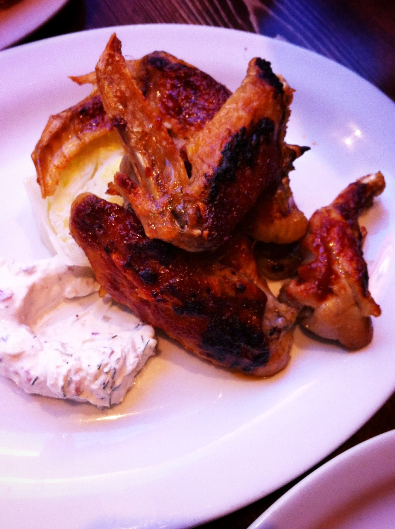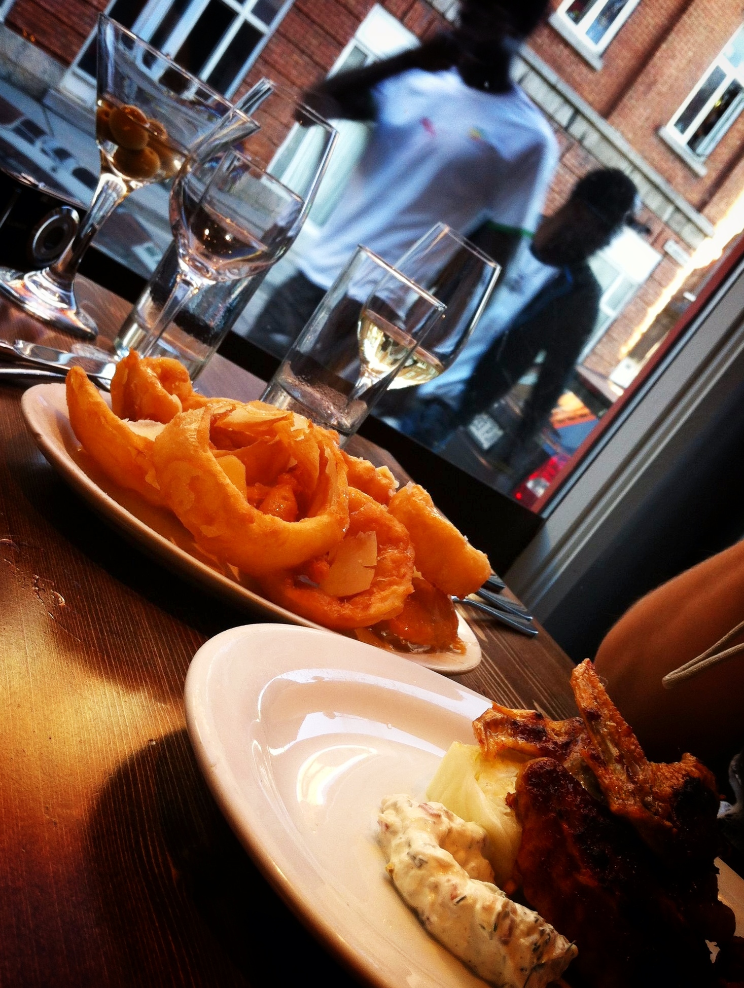 Lors de notre première visite, mes complices et moi nous sommes partagé 3 petites patentes: les accras de morue, les fameux onions rings avec miel et copeaux de parmesan, et les ailes de pintade. Verdict: collant, sucré, gras, savoureux, bref… exactement ce qu’on veut! En fait, ces 3 petites patentes pourraient presque faire office de repas pour 1 personne, ou encore servir de copieux 5 à 7 pour 2 personnes.