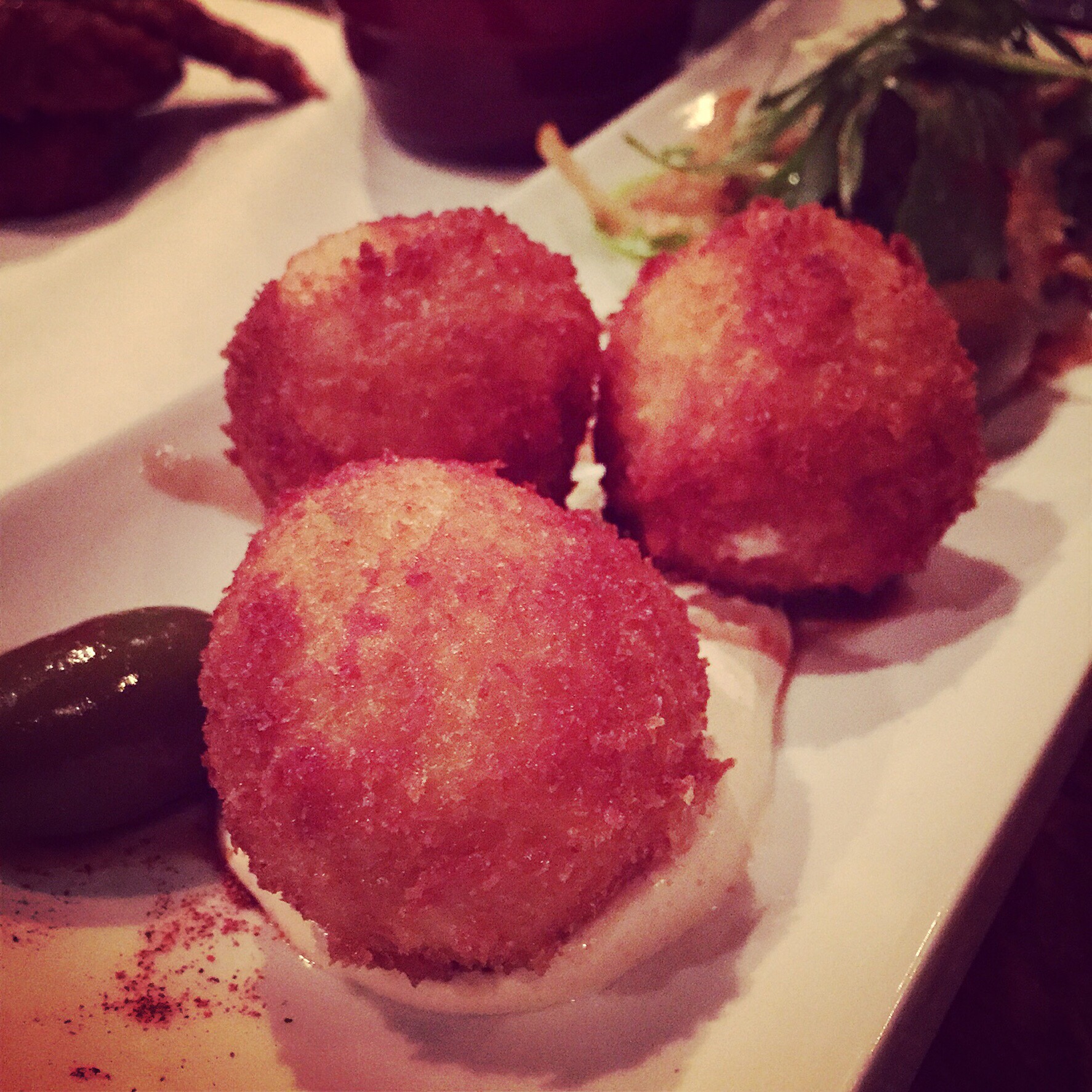 J’ai eu raison de me laisser tenter. Non seulement la carte est-elle constituée de vins d’importation choisis avec soin, mais le menu est également surprenant. On m’a vanté le spaghetti poêlé 24h, mais je me suis laissée tenter par les arancinis de porc braisé.