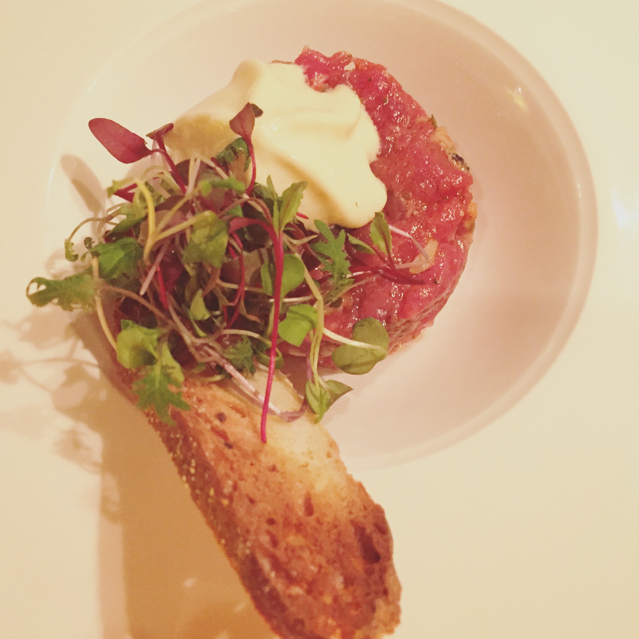 Un bar à cru: La belle idée! En plus, chacun des plats de cette section du menu peut être accompagné de frites ou de salade moyennant supplément – c’est une belle façon de se créer un plat complet sans se ruiner. Parmi les plats savourés, mentionnons un gravlax de truite des plus onctueux (respect!), et un sashimi de bar sauvage servi avec suprêmes de pamplemousse, des saveurs explosives de fraîcheur.
