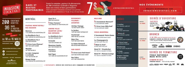 Le festival Invasion Cocktail se déploiera dans 36 bars et restaurants de Montréal et de Québec. C’est au total plus de 200 créations cocktails exclusives et originales que nos virtuoses du cocktail présenteront tout au long de la semaine – en moyenne, c’est 6 à 8 créations uniques qui nous seront proposées dans chaque établissement… C’est dire que le déplacement vaut la peine, et surtout, on ne se ruinera pas: un passeport en vente au coût de 20$ (disponible en ligne ou dans certains établissements partenaires) permet d’obtenir tous les cocktails au prix unique de… 7$!
