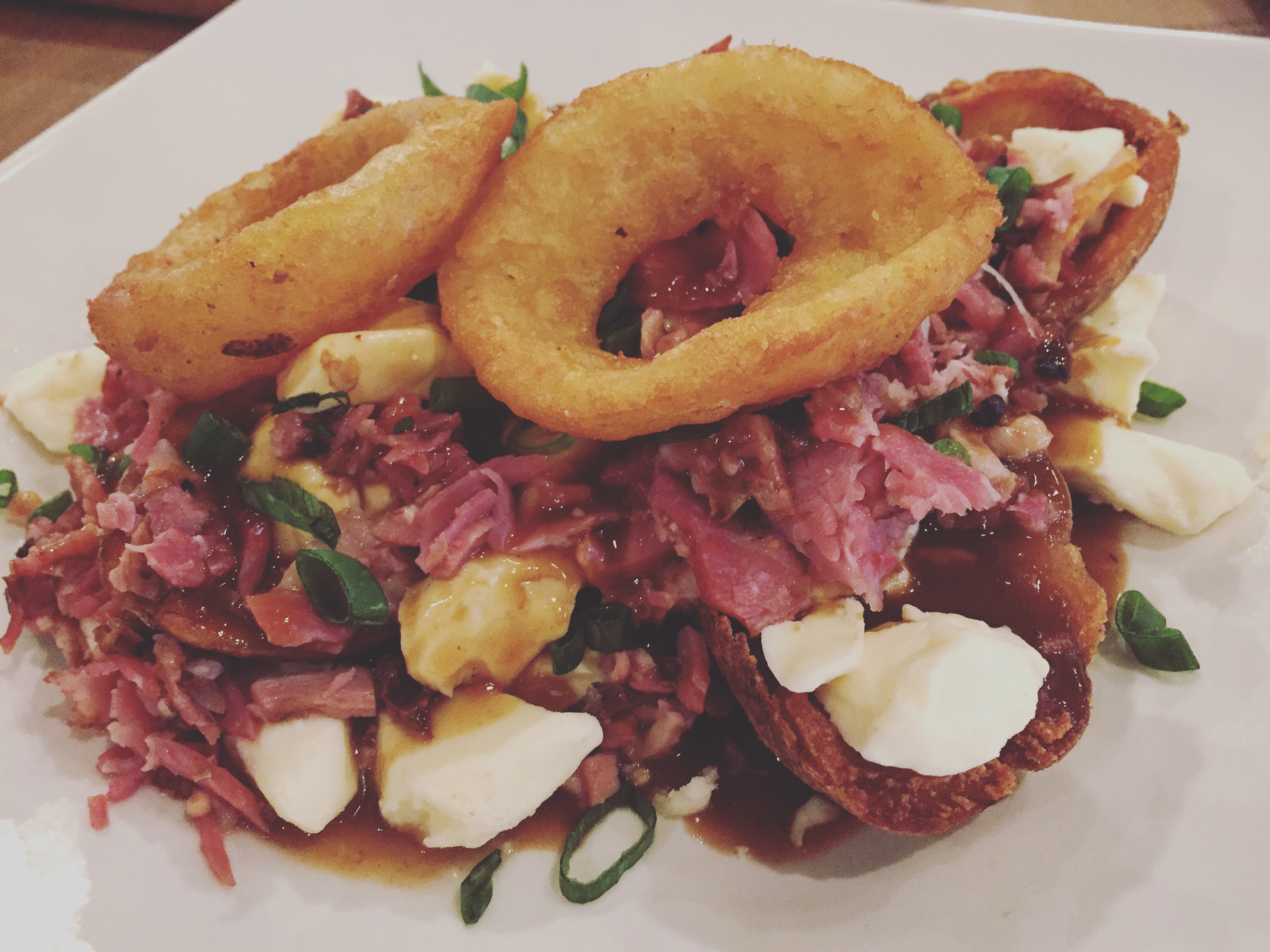 Pelures de pommes de terre, fromage en grains, smoked meat, sauce à la bière Stout et oignons français.