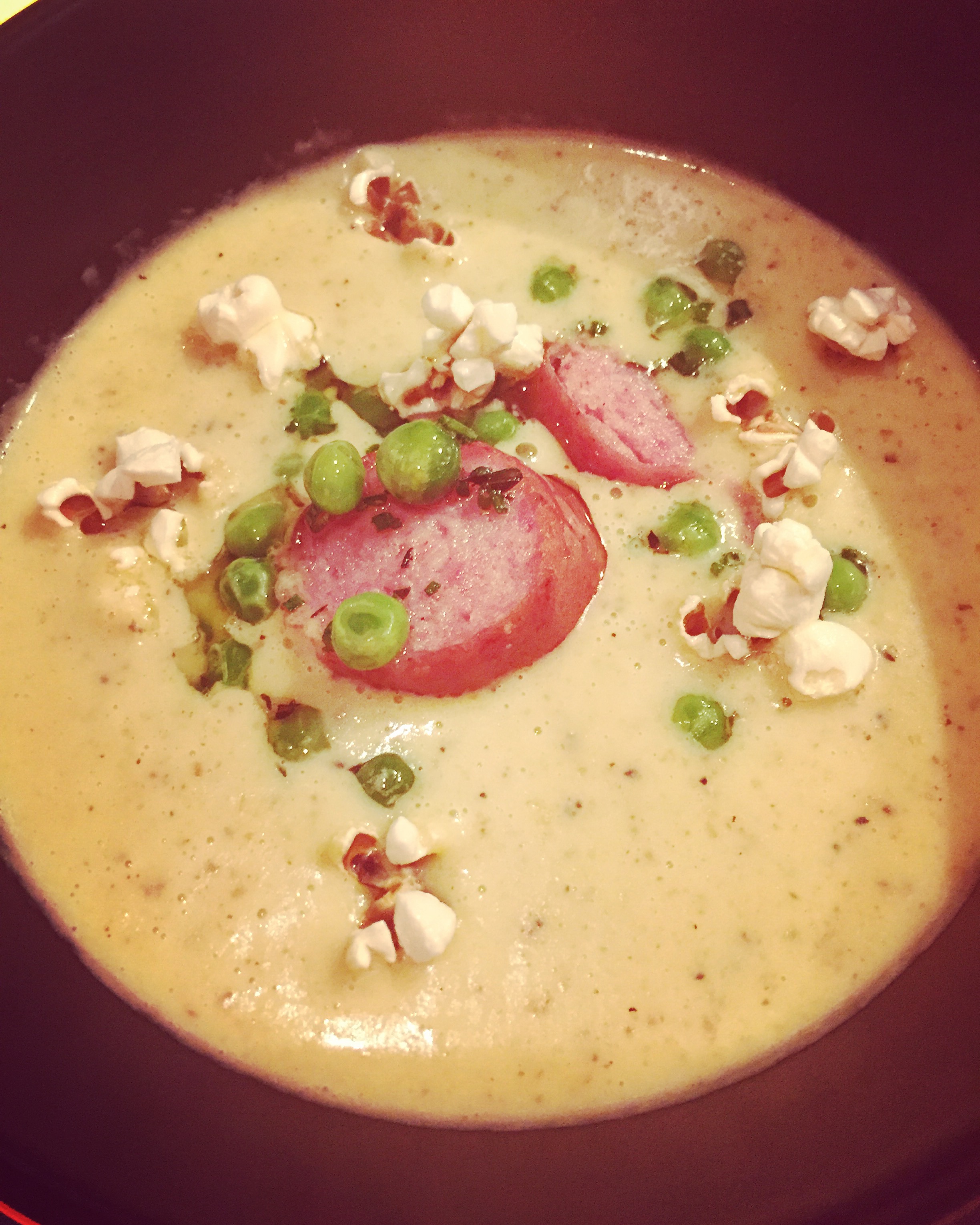 Crème de Pop-corn et sa garniture de saucisse fumée, pois vert et pop-corn au sel fumé