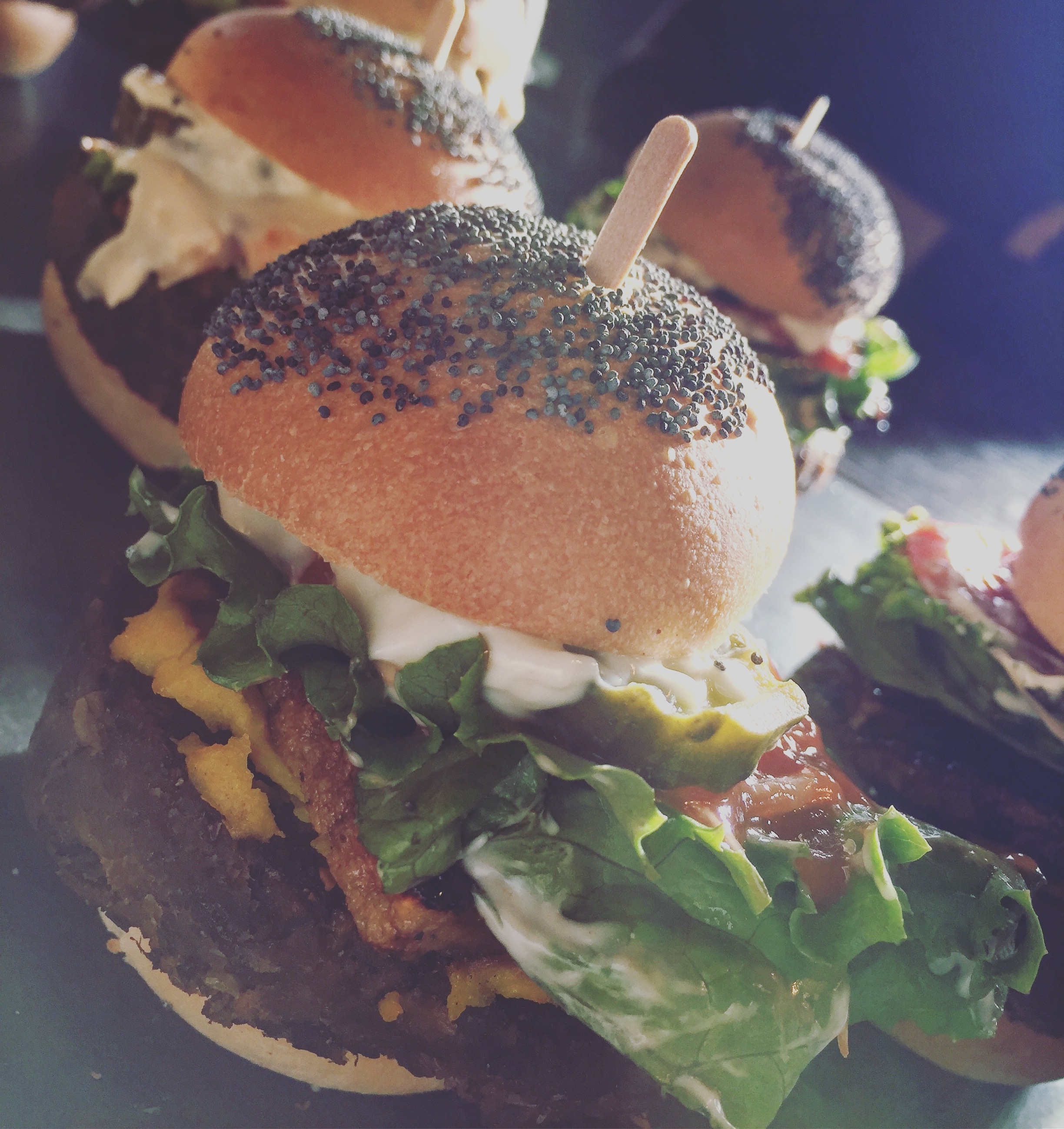 Menu : Le No Cheese No Beef Burger (Vegan) – boulette de seitan de lentilles verte aux épices de la Bête Bar steakhouse, bacon fumé de tofu, faux’mage orange, cornichons Bread and Butter, oignons doux, tomate, laitue, ketchup, moutarde baseball et VGnaise.